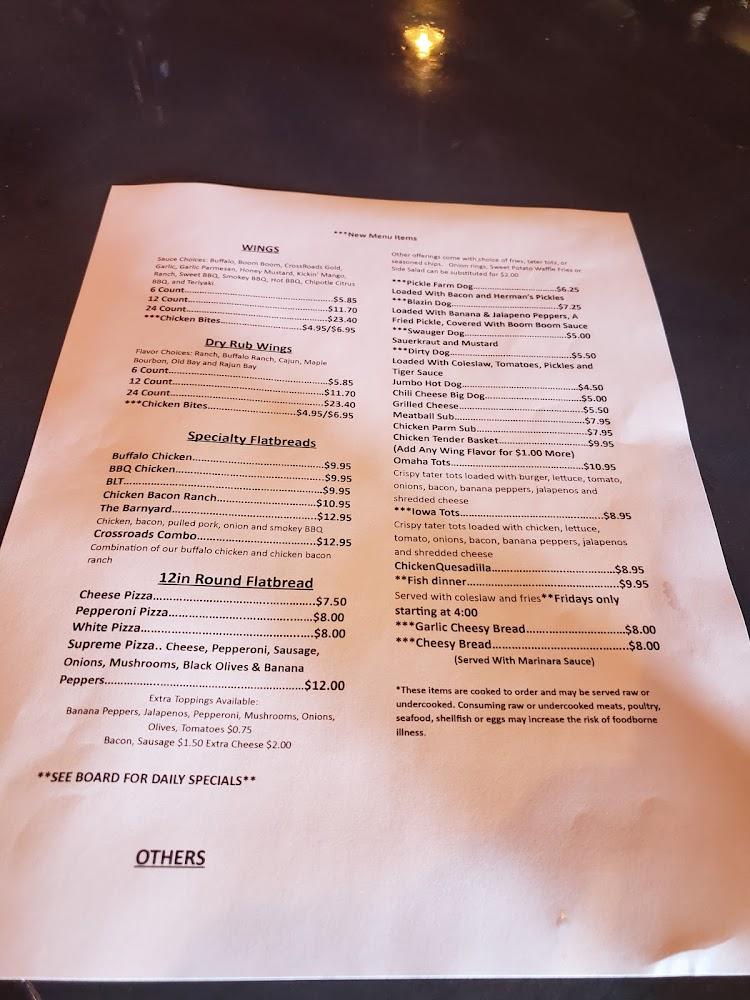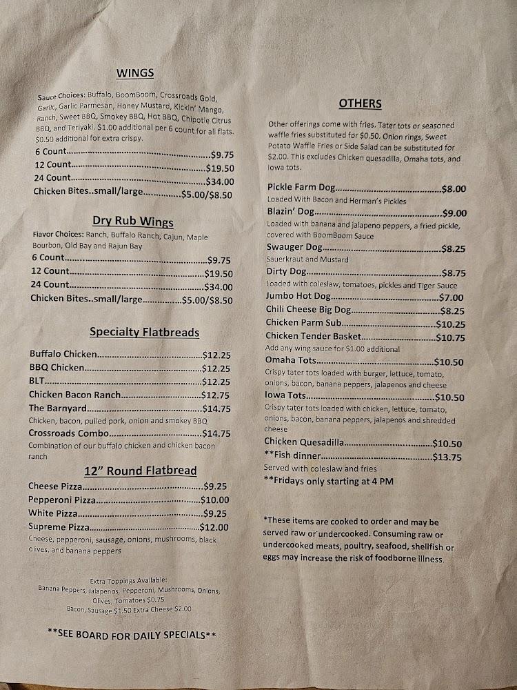 The menu at Crossroads Bar & Grill Inc features a wide array of dishes, catering to different tastes. Starters include fresh-cut fries and deep-fried mushrooms that pair well with beverages. For salads, options like the Taco Salad provide a fresh contrast to the hearty entrees. The sandwich section is robust with choices, from sizzling burgers to BBQ pork. Health-conscious diners will appreciate the grilled chicken wraps and salads. Pizza lovers can select from a simple cheese to a supreme delight. Overall, the menu captures the essence of comfort food with a local twist, satisfying every craving.